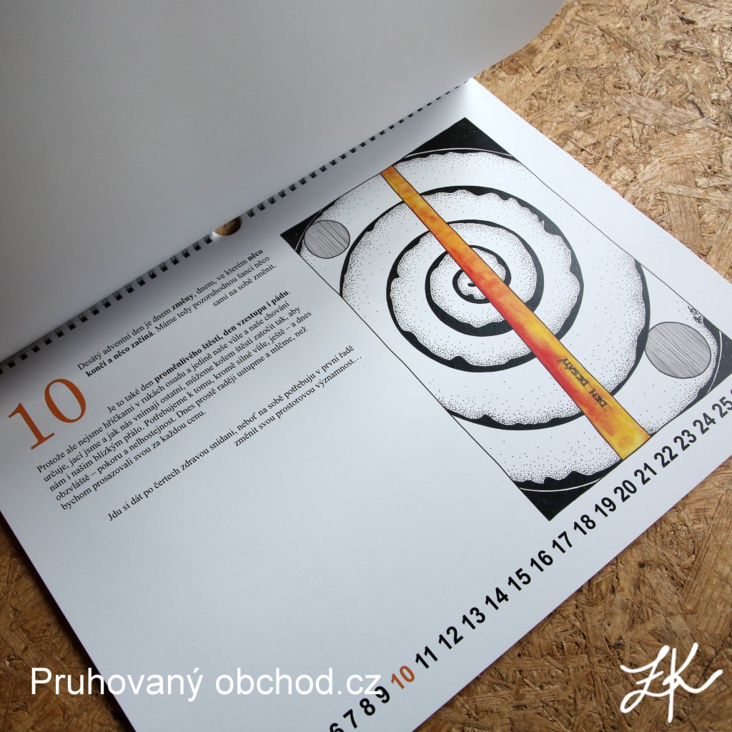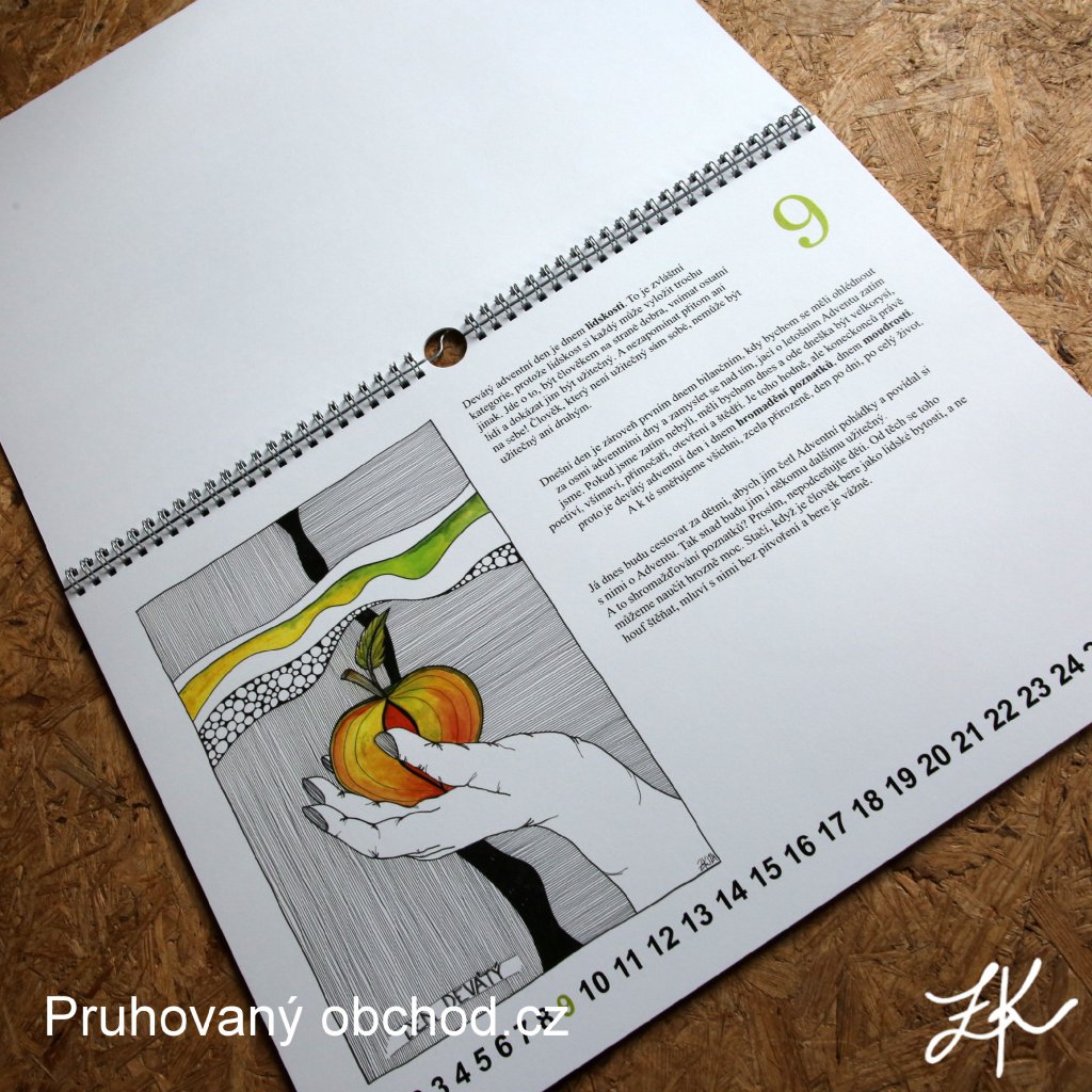 "Doživotní kalendář na všechny adventní dny. Každý den v Adventu má svou energii a svůj účel. Kalendář ho jednak definuje a jednak přináší podněty, jak se kterým dnem naložit, tu a tam odkazuje k tradicím a symbolice. Je to prostě takové povídání o Adventu mimo nás, ale hlavně v nás. Slovem, ale i ilustracemi, které nejsou popisné a sdělují jinou cestou totéž, co text." RK
