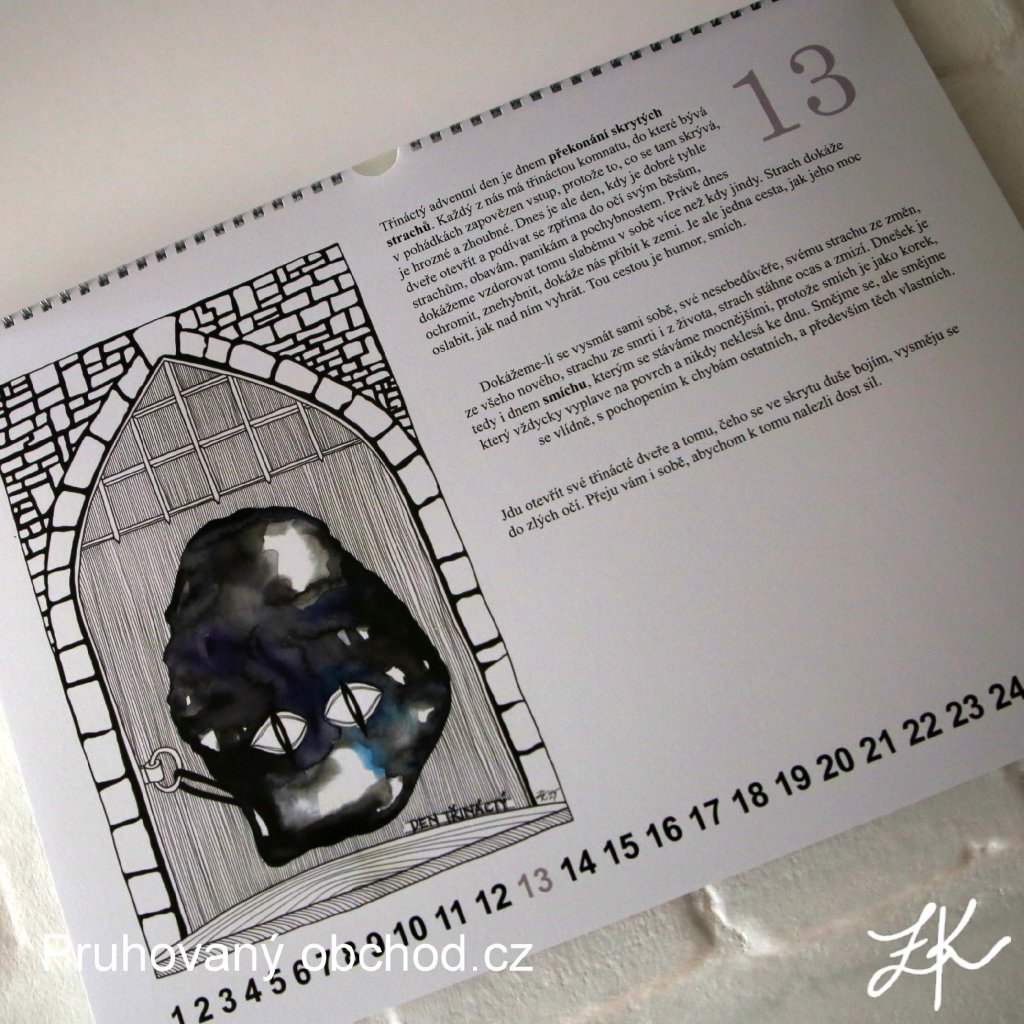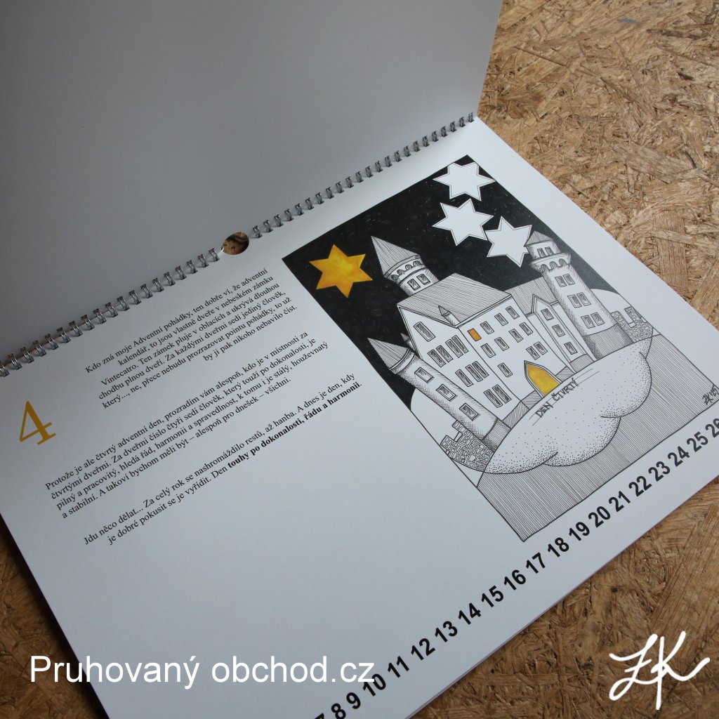 Vytvořila jsme spolu s panem spisovatelem Rostislavem Křivánkem, který psal několik let povídání ke každému Adventnímu dni na FB, Adventní kalendář. Každý den má svůj osobitý text, myšlenku či zamyšlení, a k tomu ilustraci ode mne. K té myšlence. Podtrhující zásadní část. Nebo občas jen jako doplněk k textu. Někdy zahraje na duši text, jindy ilustrace a doufám, že nejčastěji obojí, protože přesně tak jsme to mysleli. Přinášíme podněty, co s kterým adventním dnem. O čem přemýšlet, co zkusit, co změnit, nač se zaměřit. Jak si zasloužit světlo.