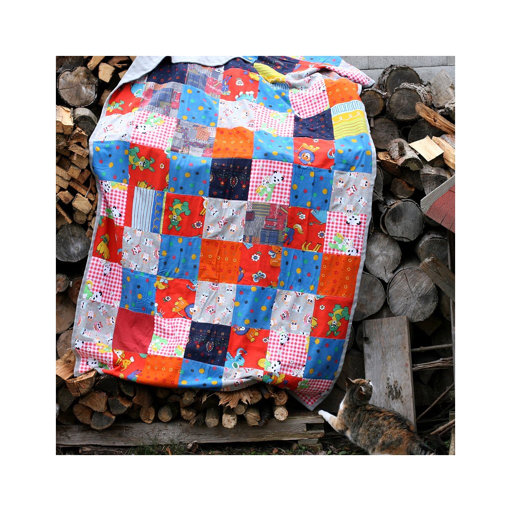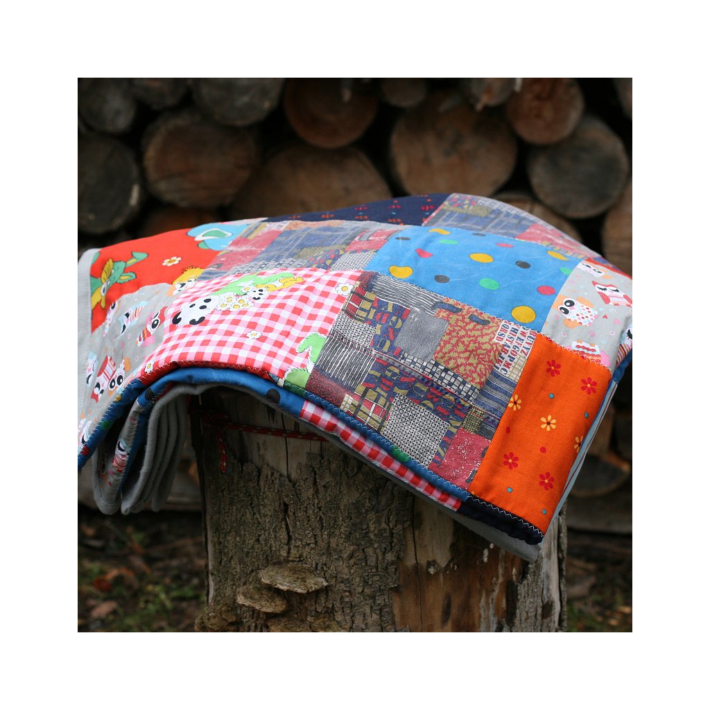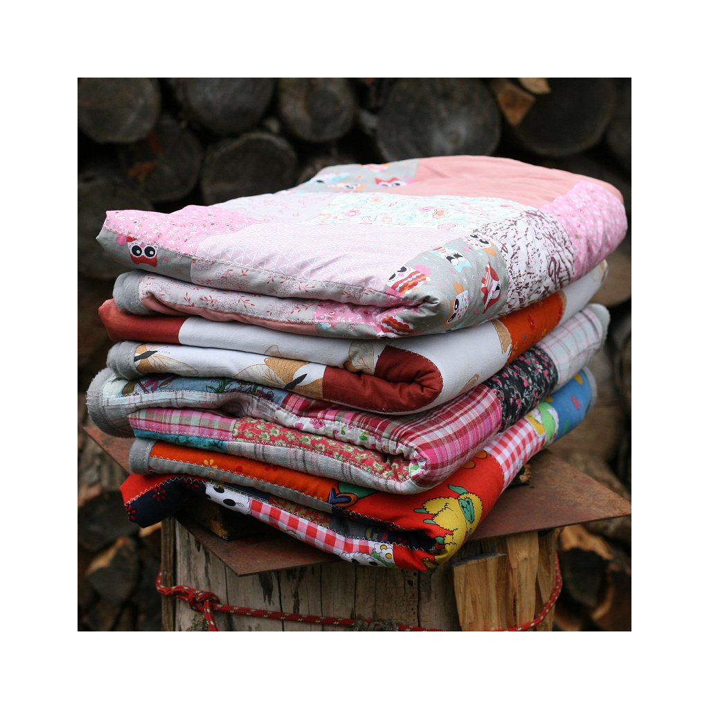 Kombinacbe mých zbytků, vzorků a pokladů starých skříní. Deky jsou podšité pouze fleecem. V kratším směru prošitá entlem, stejně tak entlem přišitý fleecový lem. Tato je podšita šedým fleecem.
