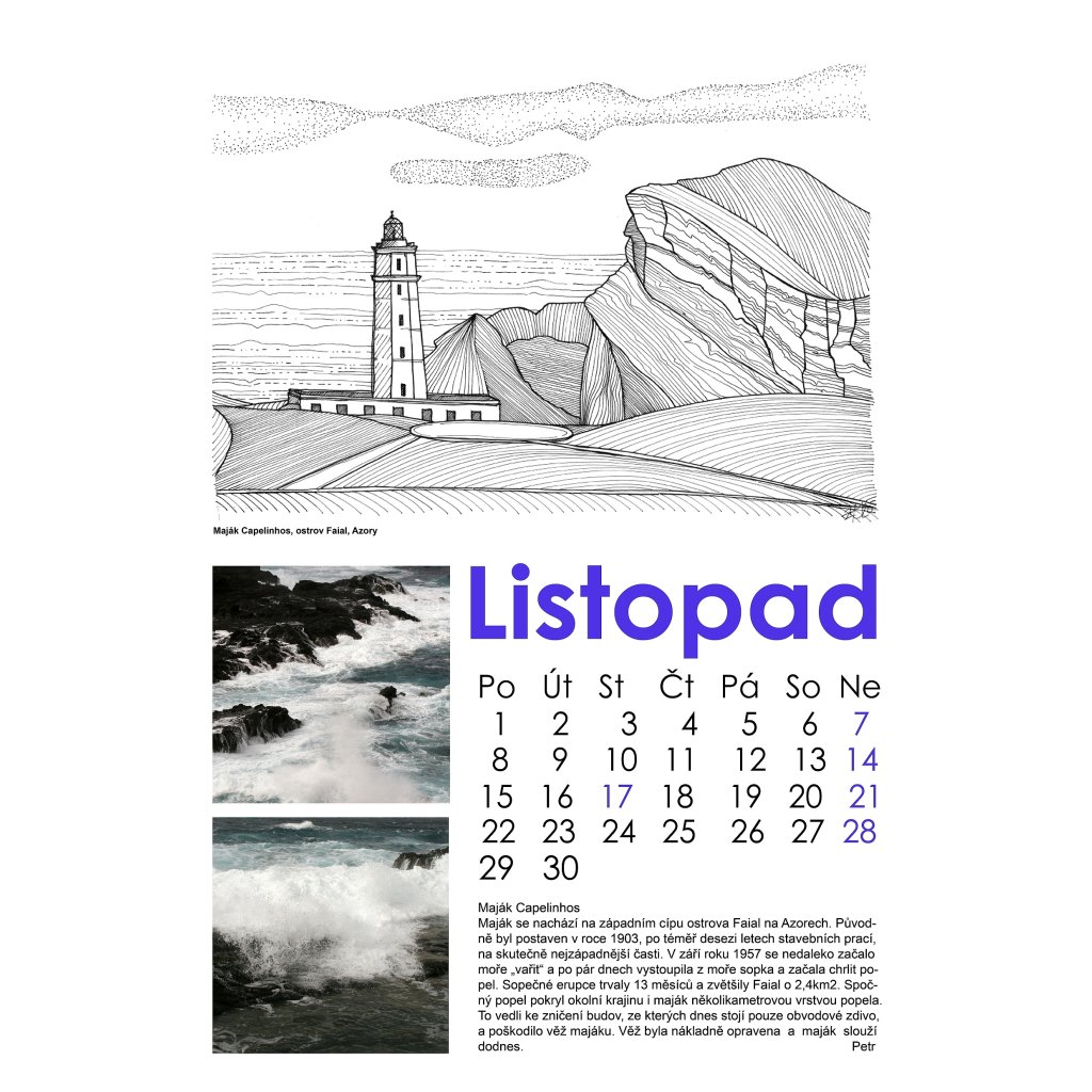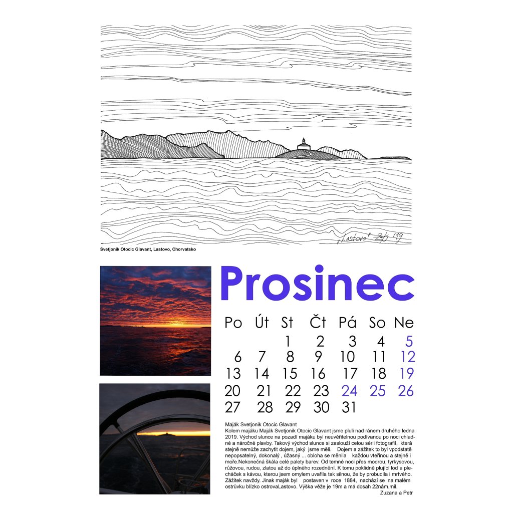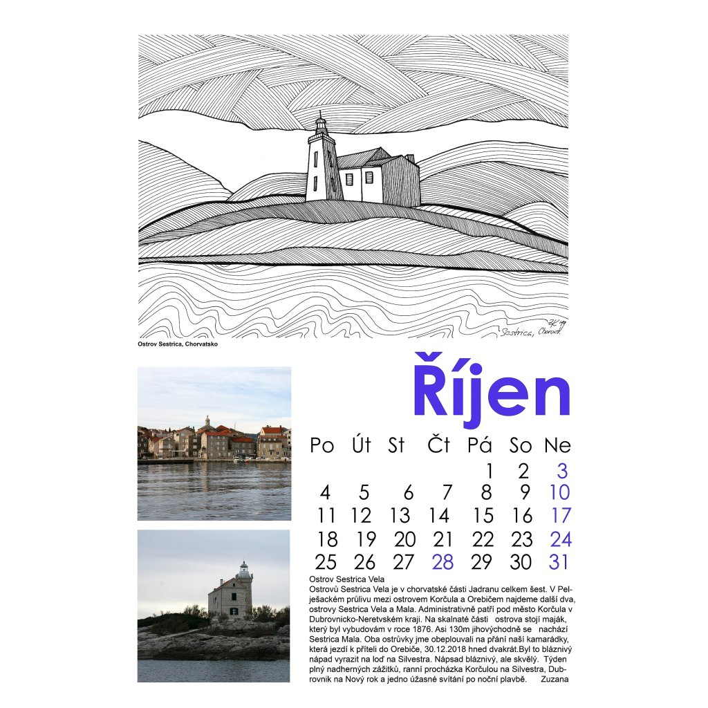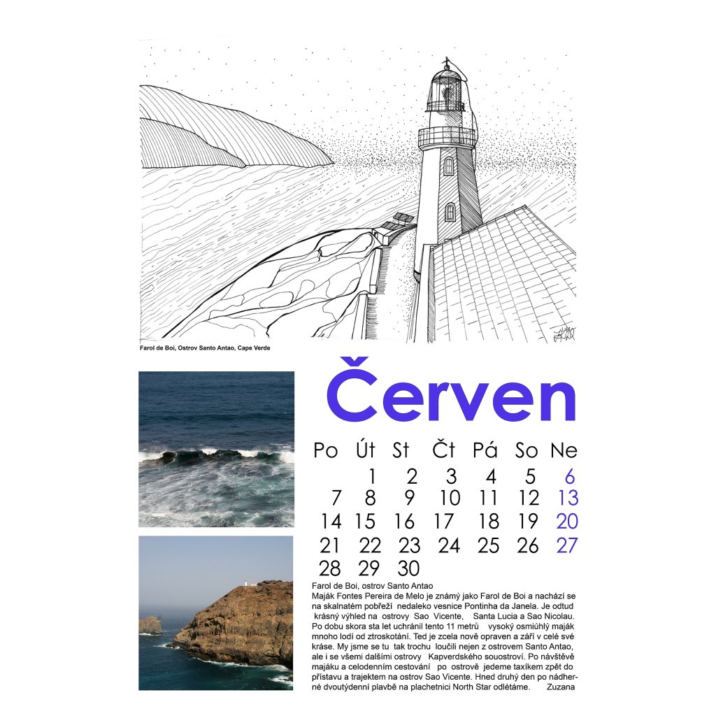 Je za ním spousta krásný a dlouhých večerů, kdy vznikaly perokresby, a taky spousta zážitků z cest, poslední dobou hlavně na plachetnici, i když nejen. Kalendáře dělám už vlastně 30let (uf, tolik). Napřed plakátové, pak měsíční s nalepenými fotkami, pak už s digitálními fotografiemi a komplet v pc. Je to vlastně taková letitá touha, nenechat si fotografie z cest jen v šuplíku u stolu. No a nyní, již podruhé to nejsou jen fotografie, ale i perokresby, které mne velmi baví a taky je to po druhé, kdy ho nabízím k prodeji. Je to takové dlouhodobé dílo a osobní výpověď, o kterou mám chuť se podělit. 12 kreseb, doplněných fotografie ze stejných míst. Jako bonus je ke každému majáku ještě přidán příběh. Příběh o historii, o plachtění, poznání, zážitcích. Fotografie jsou mé a mého muže Tomáše, příběhy pak společně se mnou doplnil kamarád Petr, ten který může za to, že námořnímu jachtingu jsme propadli celá rodina.
