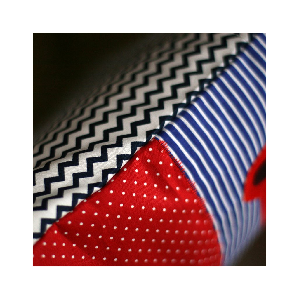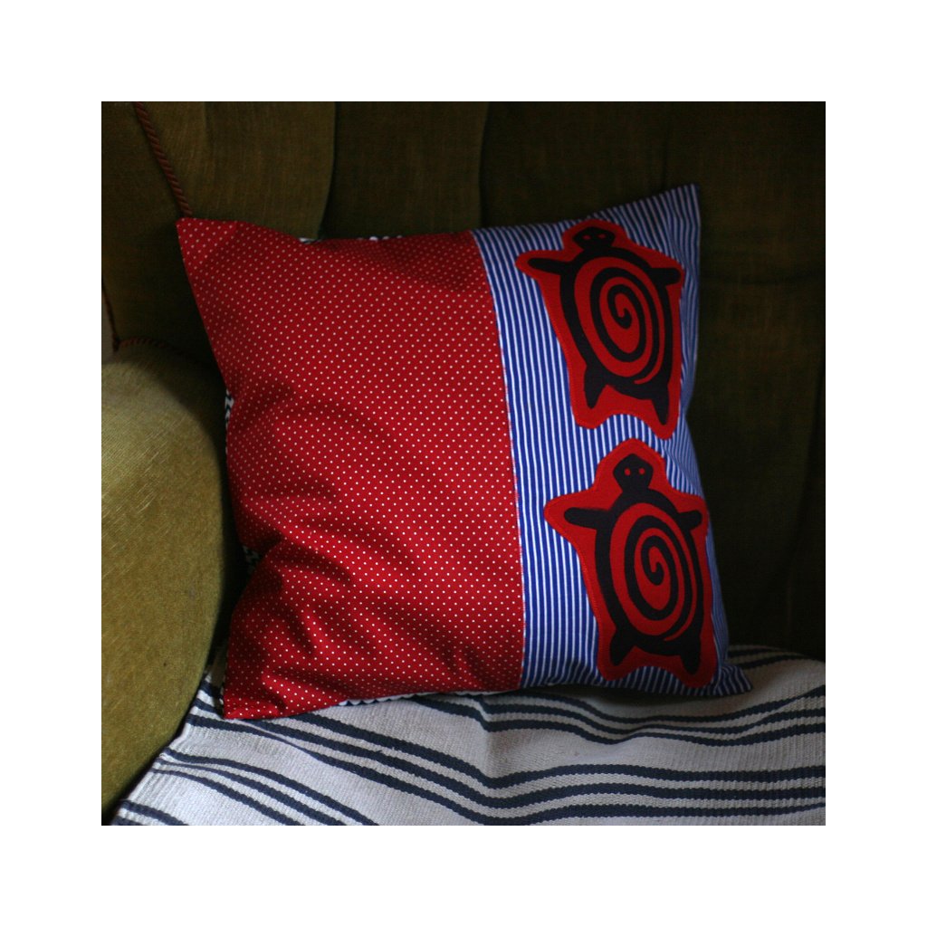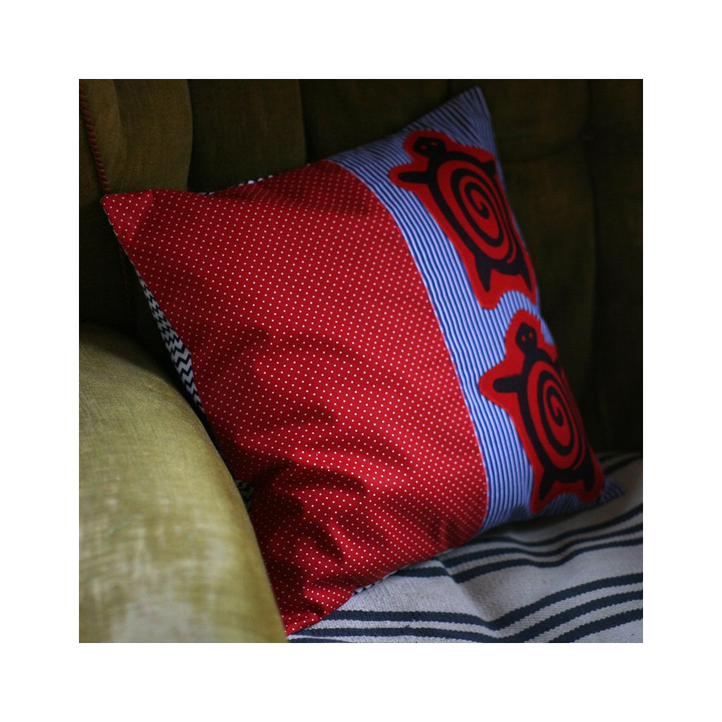 Povlak na polštář, sestaven vždy z několika látek, doplněn autorským linorytem. Každý kus je originál, vyhotoven většinou po jednom kusu. Výplň není součastí. Zadní část je řešena obálkově (skrytý plnicí otvor ze zadní strany, tj. bez knoflíků). Lze prát na 40°.