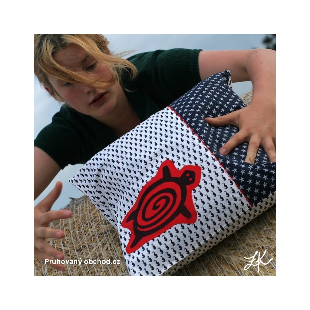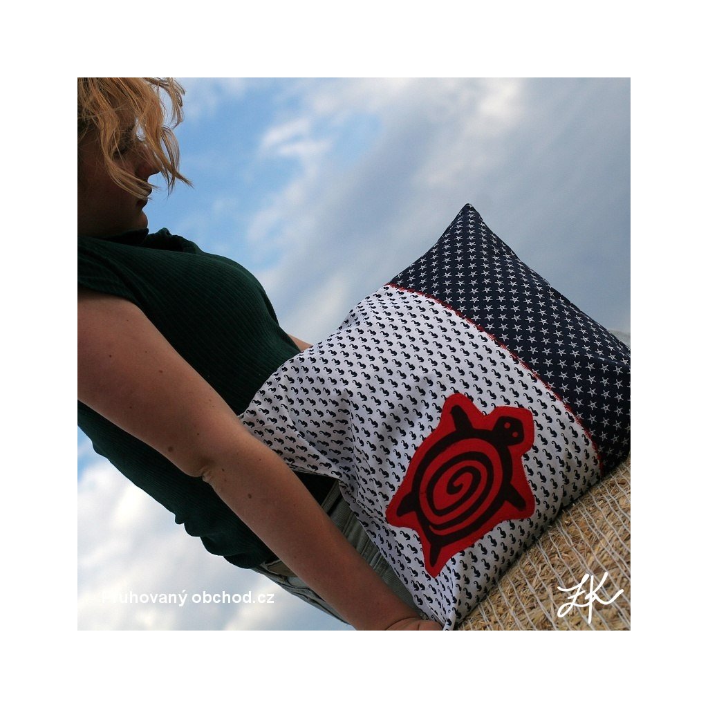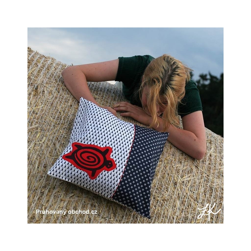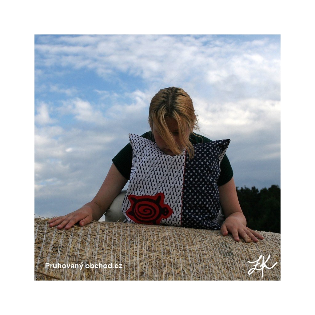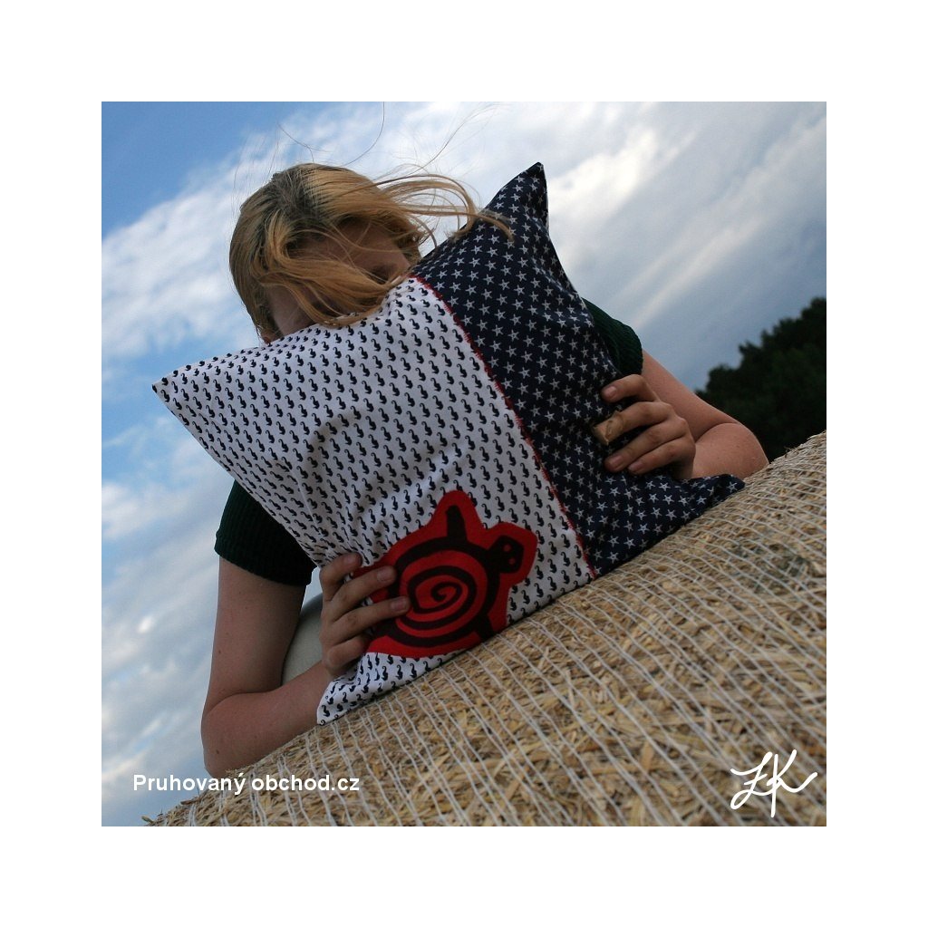 Povlak na polštář, sestaven vždy z několika látek, doplněn autorským linorytem. Každý kus je originál, vyhotoven většinou po jednom kusu. Výplň není součastí. Zadní část je řešena obálkově (skrytý plnicí otvor ze zadní strany, tj. bez knoflíků). Lze prát na 40°.