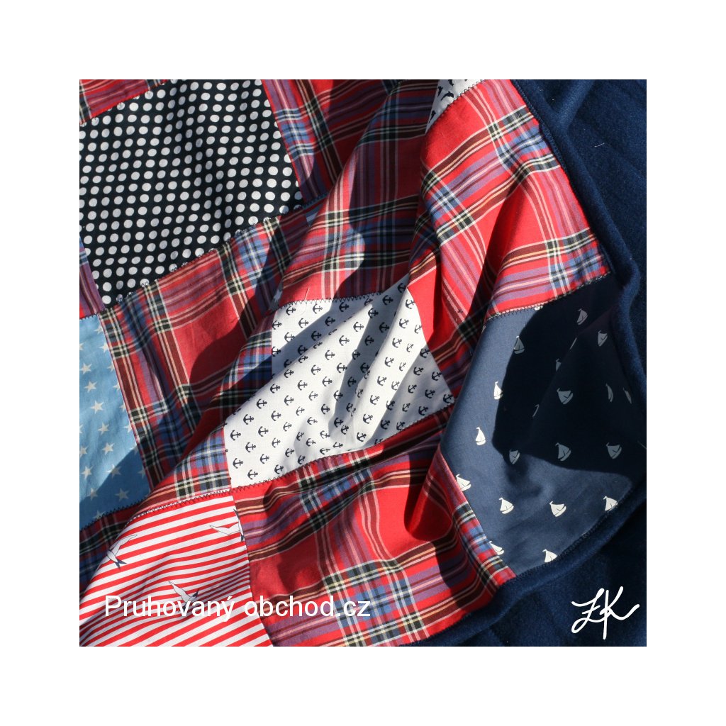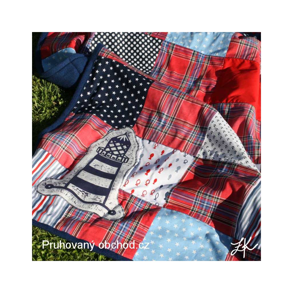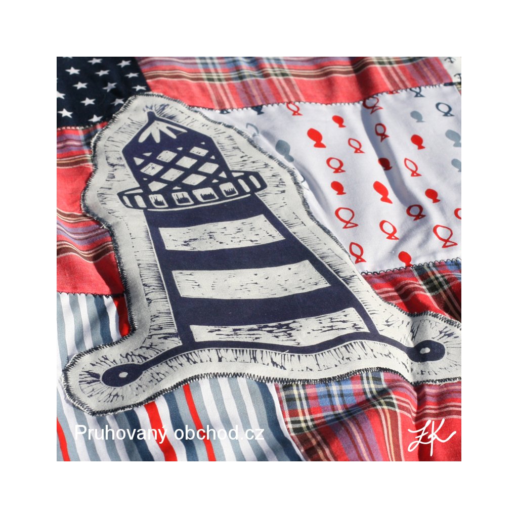 Kombinacbe mých zbytků, vzorků a pokladů starých skříní, tentokrát v námořnickém stylu, neboť od jiných výrobků zbývaly přesně vhodné odstřižky námořnických látek. A ještě s našitým linorytovým majákem pro radost. Deky jsou podšité pouze fleecem. V kratším směru prošitá entlem, stejně tak entlem přišitý fleecový lem. Tato je podšita námořnicky modrým fleecem.
