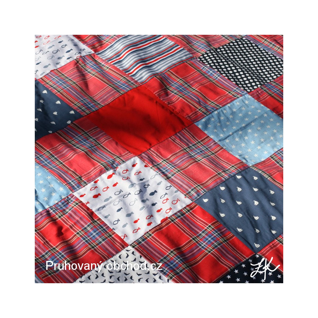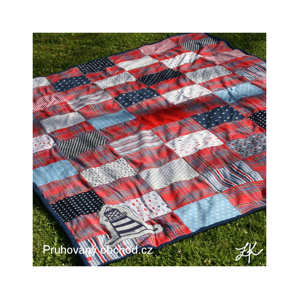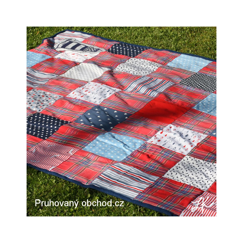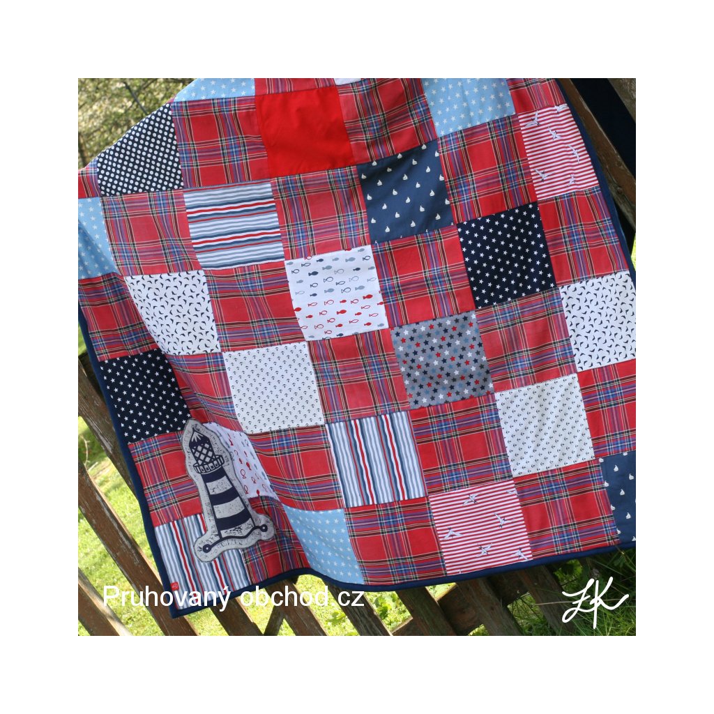 Kombinacbe mých zbytků, vzorků a pokladů starých skříní, tentokrát v námořnickém stylu, neboť od jiných výrobků zbývaly přesně vhodné odstřižky námořnických látek. A ještě s našitým linorytovým majákem pro radost. Deky jsou podšité pouze fleecem. V kratším směru prošitá entlem, stejně tak entlem přišitý fleecový lem. Tato je podšita námořnicky modrým fleecem.
