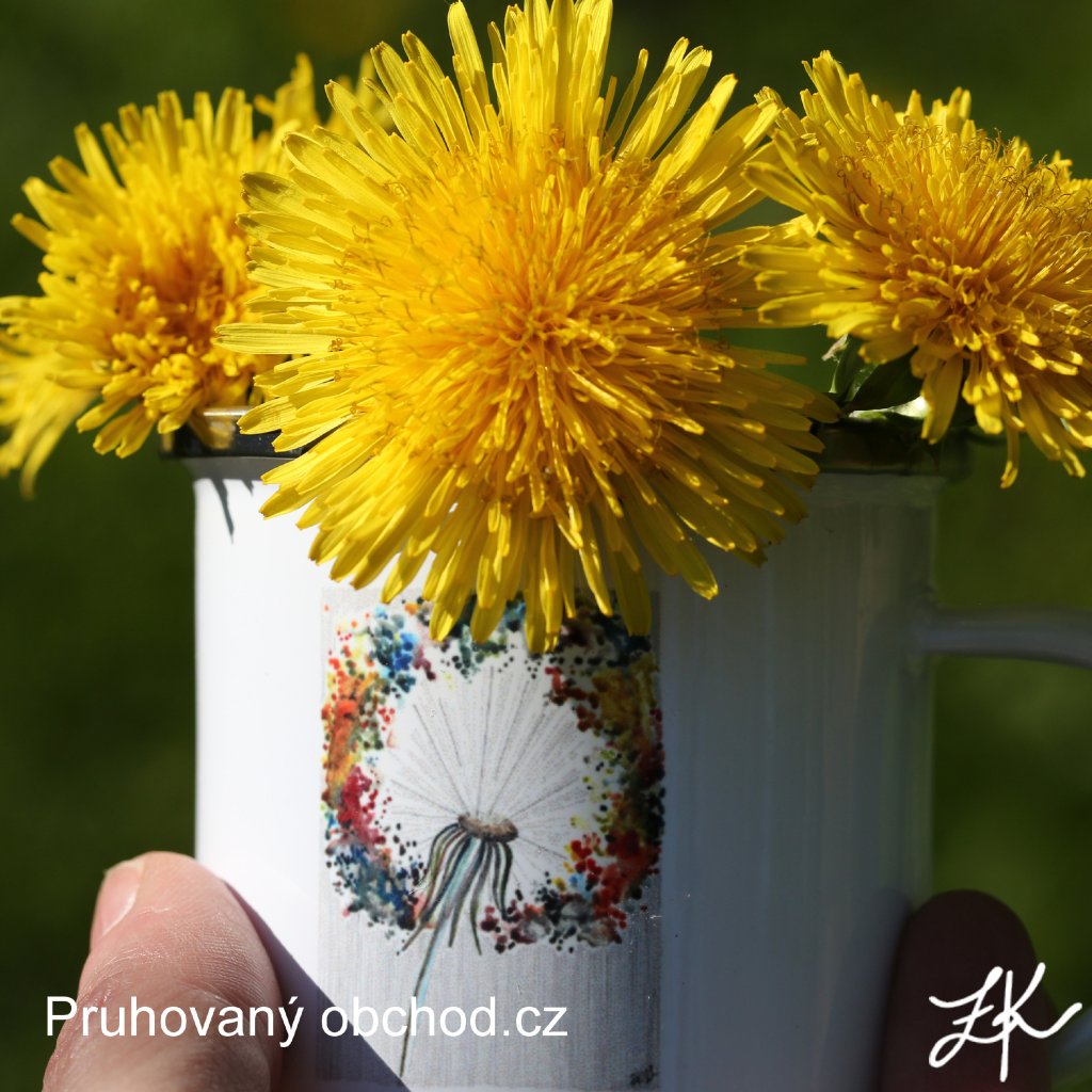 Duhová pampeliška. Vznikla náhodou. Trochu jako cvičení na barvy. A líbí se. A líbí se tak moc, že je z ní i potisk na plecháček. Duhová pampeliška jako symbol pomíjivosti štěstí a duha jako symbol věčné naděje.