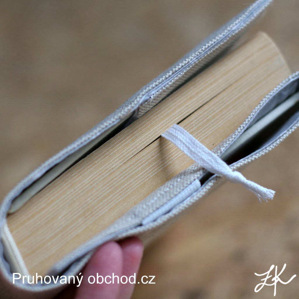 Obaly na knihy mají jednu záložku pevně ušitou, druhá se tvoří pomocí všité gumy, je tedy možné ho upravit na různě silnou knihu. Je všita textilní záložka. Výška obalu cca 23 až 24,5cm. Tloušťka hřbetu až 6cm.
