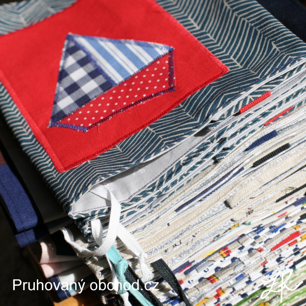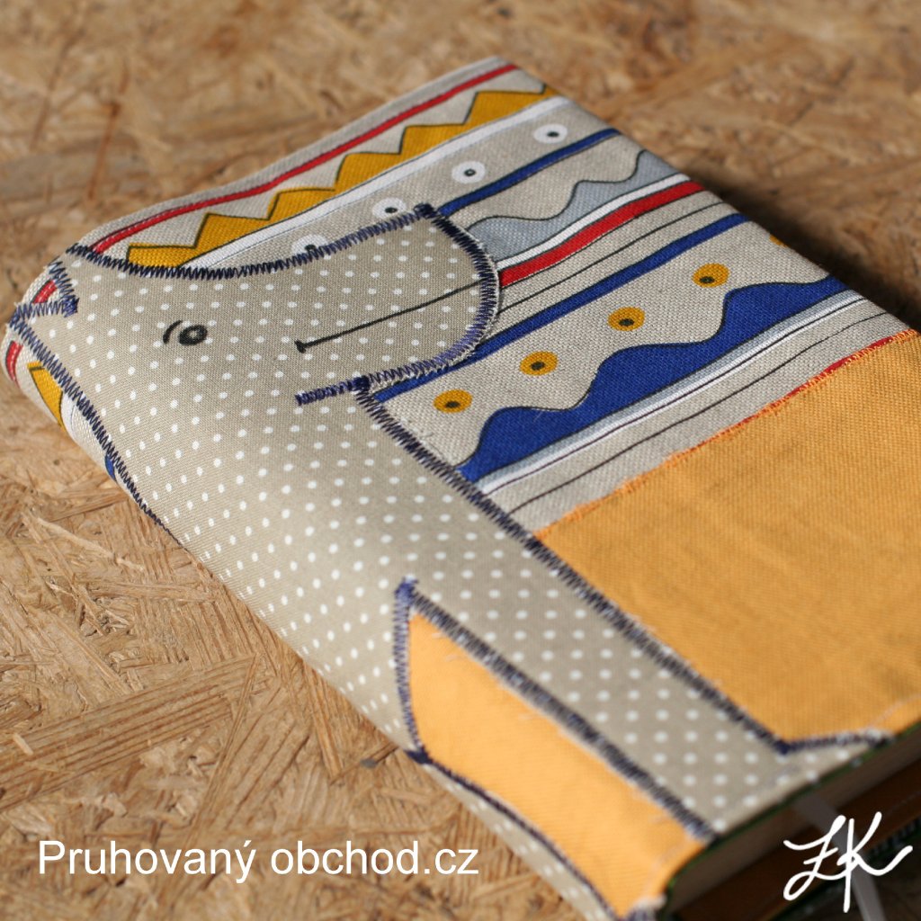Obaly na knihy maji jednu záložku pevně ušitou, druhá se tvoří pomocí všité gumy, je tedy možné ho upravit na různě silnou knihu. Je všita textilní záložka. Výška obalu cca 23 až 24,5cm. Tloušťka hřbetu až 6cm.