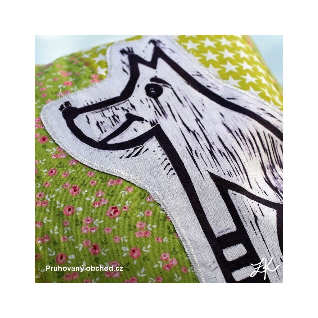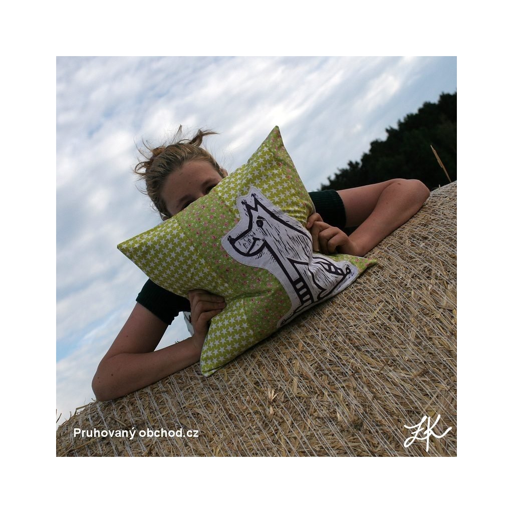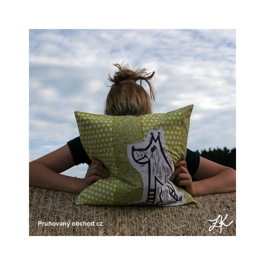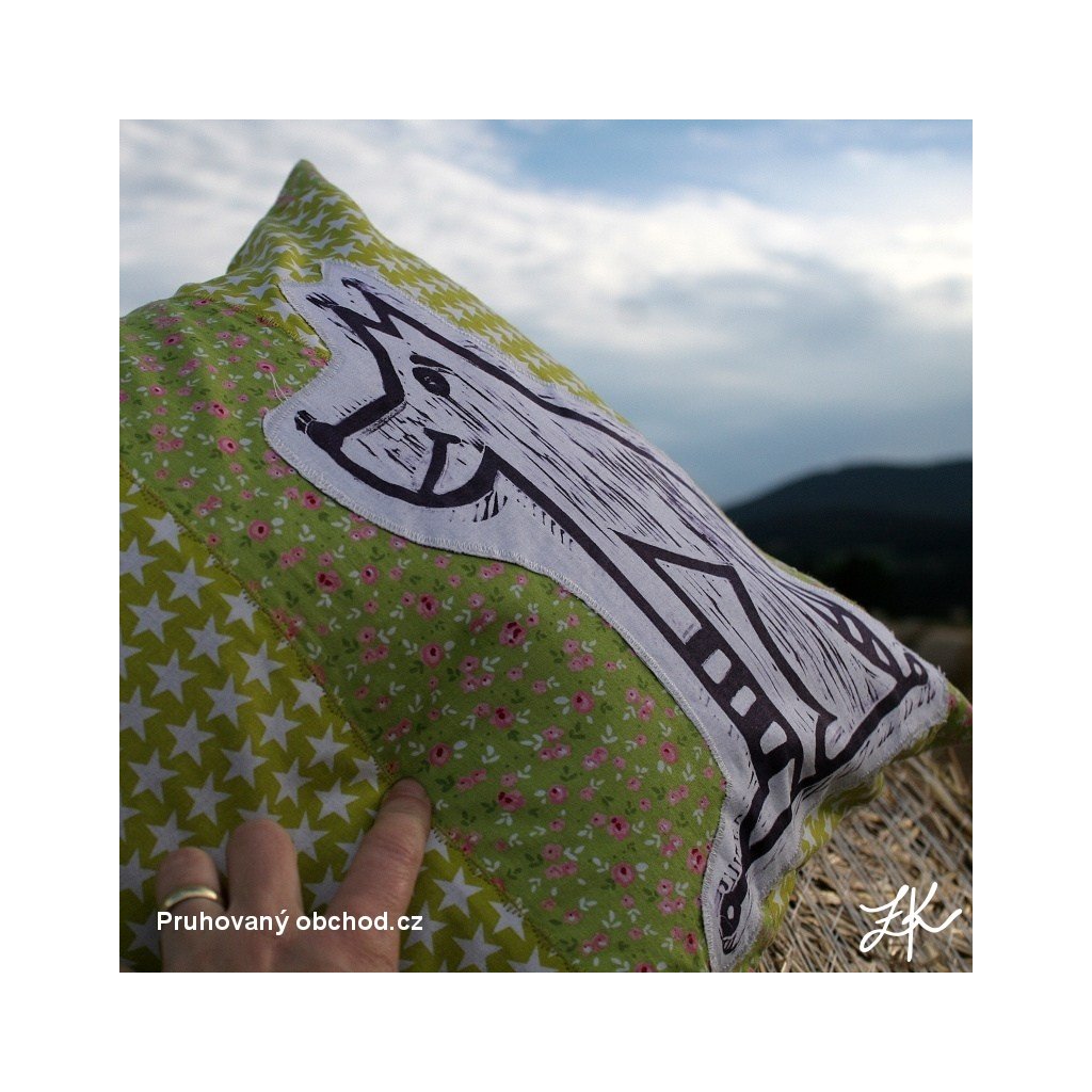 Povlak na polštář, sestaven vždy z několika látek, doplněn autorským linorytem. Každý kus je originál, vyhotoven většinou po jednom kusu. Výplň není součastí. Zadní část je řešena obálkově (skrytý plnicí otvor ze zadní strany, tj. bez knoflíků). Lze prát na 40°.