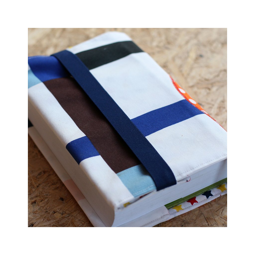 Obaly na knihy mají jednu záložku pevně ušitou, druhá se tvoří pomocí všité gumy, je tedy možné ho upravit na různě silnou knihu. Je všita textilní záložka. Výška obalu cca 23 až 24,5cm. Tloušťka hřbetu až 6cm.
