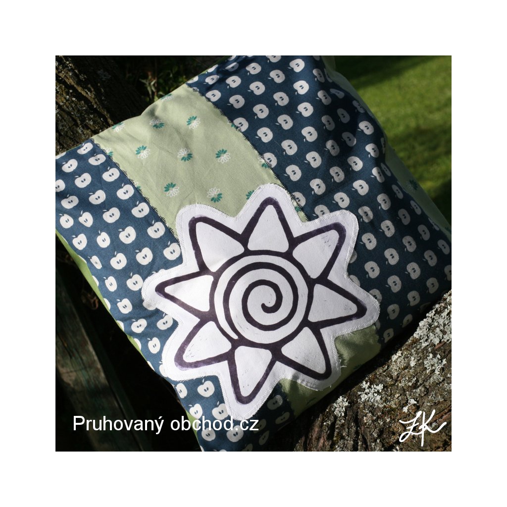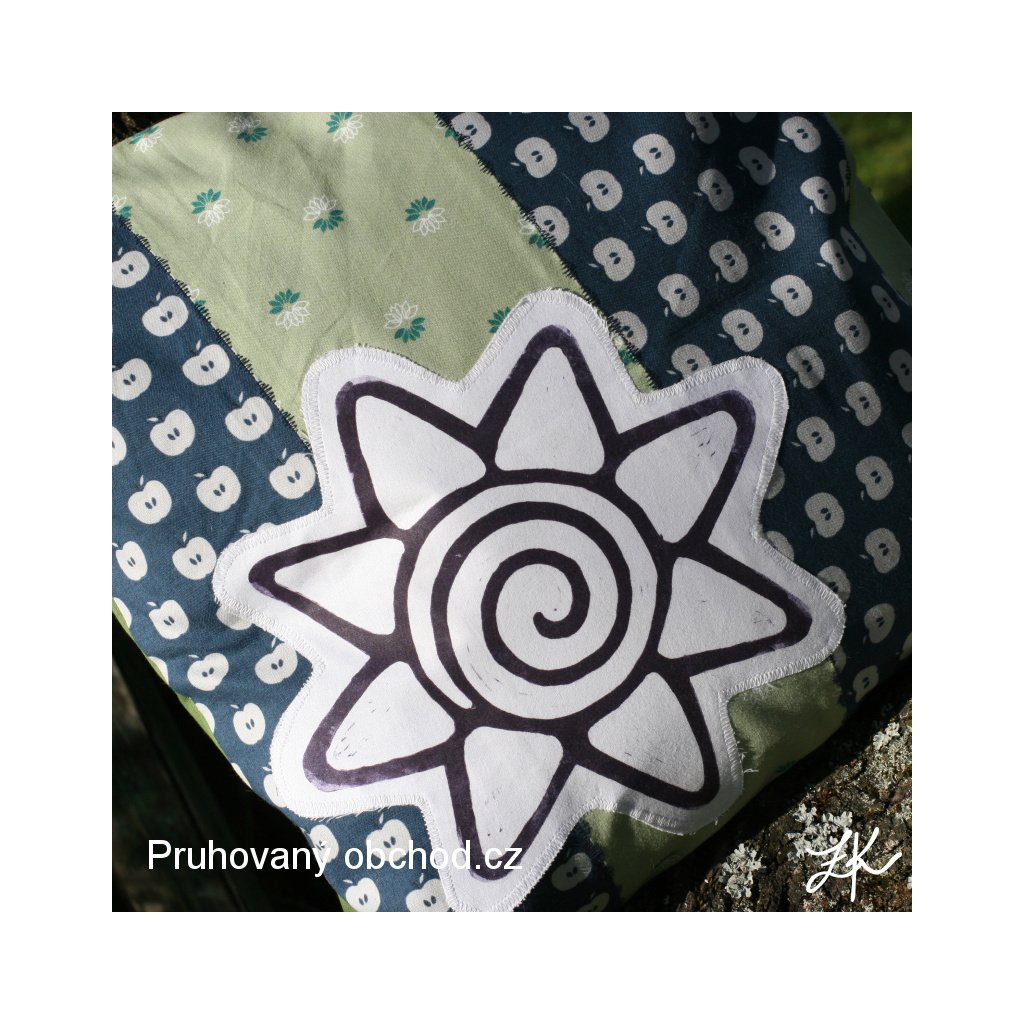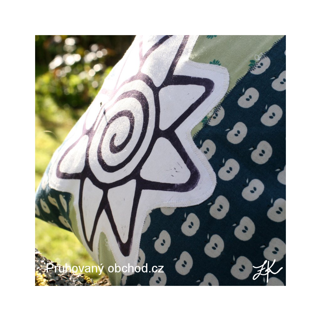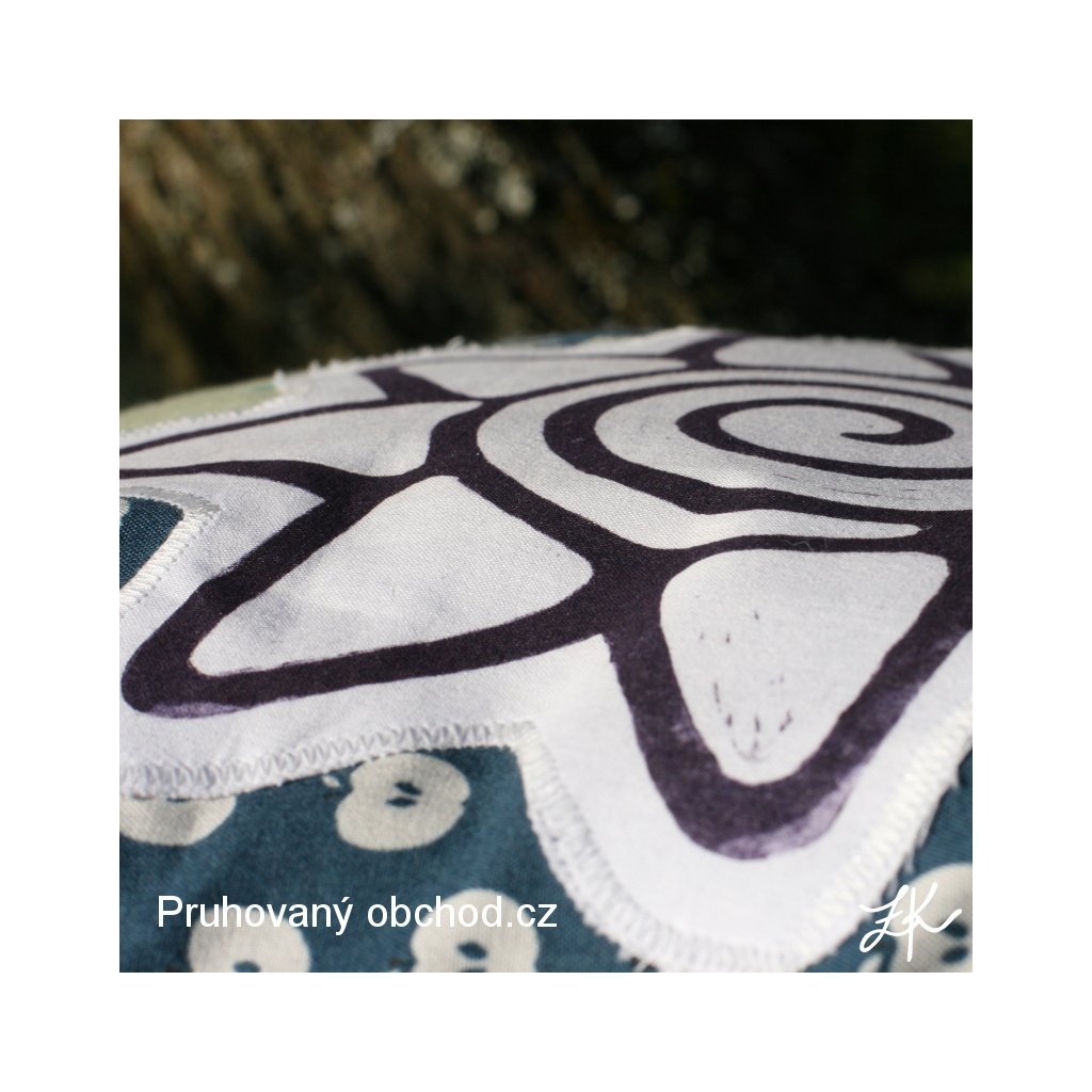 Povlak na polštář, sestaven vždy z několika látek, doplněn autorským linorytem. Každý kus je originál, vyhotoven většinou po jednom kusu. Výplň není součastí. Zadní část je řešena obálkově (skrytý plnicí otvor ze zadní strany, tj. bez knoflíků). Lze prát na 40°.