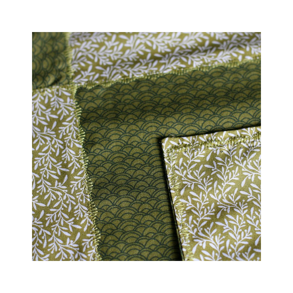 Ubrusy jsou sestaveny z 9 čtvreců, většinou v sestavě 4 čtverce jedné látky, 3 čtverce další látky a 2 čtverce z jiné látky, vybírám vždy látky a vzory k sobě ladící. Ubrus je podložen většinou jednobarevnou látkou, je tedy oboustraný, bez viditelných okrajů, švů apod.