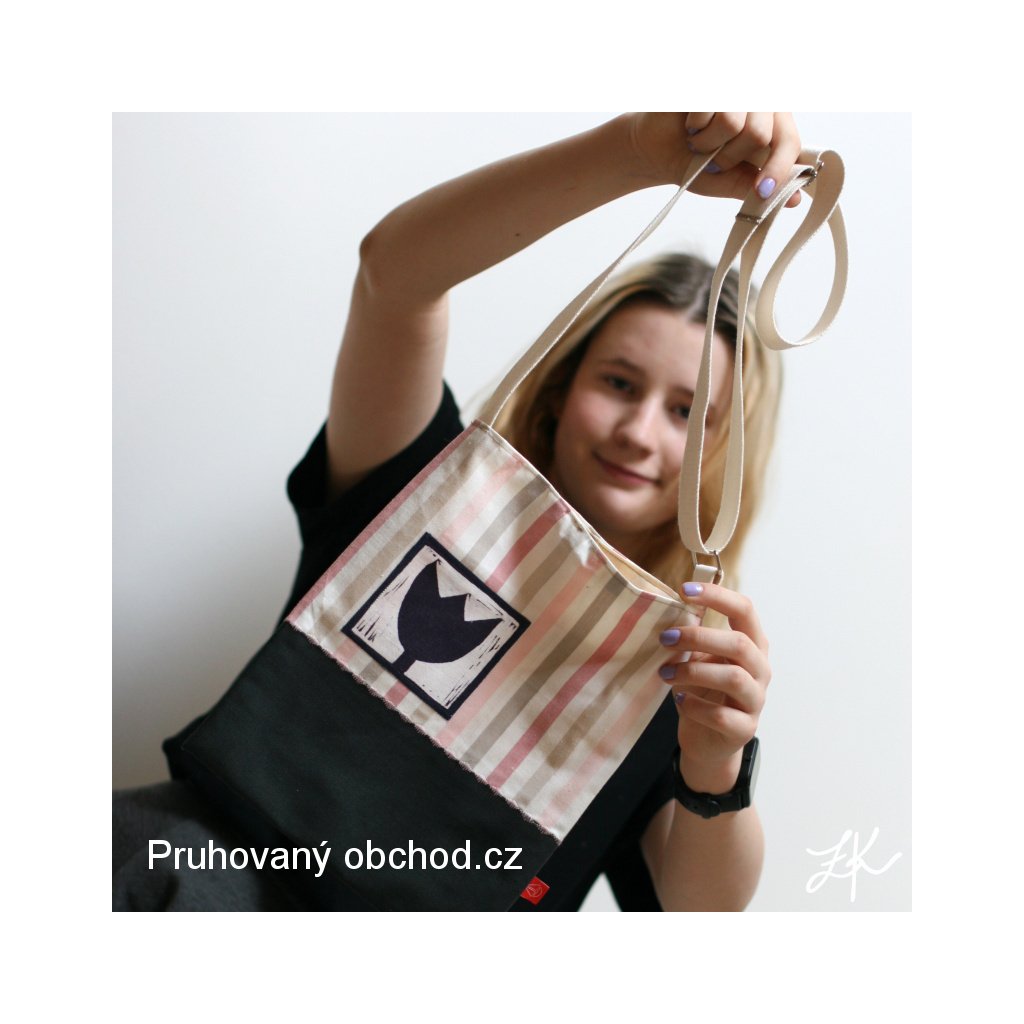 Taška je z pevných pláten, s tenčí podšívkou, vše 100% bavlna, s malou vnitřní kapsou, zapínání je magnetické, s posuvným popruhem, takže poslouží od malých slečen až po ty velké. Každá taška je zdobena autorským linorytem. Koupí všech mých výrobků s linoryty podporujete 10 korunama Společenství Dobromysl v Srbči https://www.facebook.com/spolecenstvi.dobromysl/?fref=ts . Za Společenství děkuji.