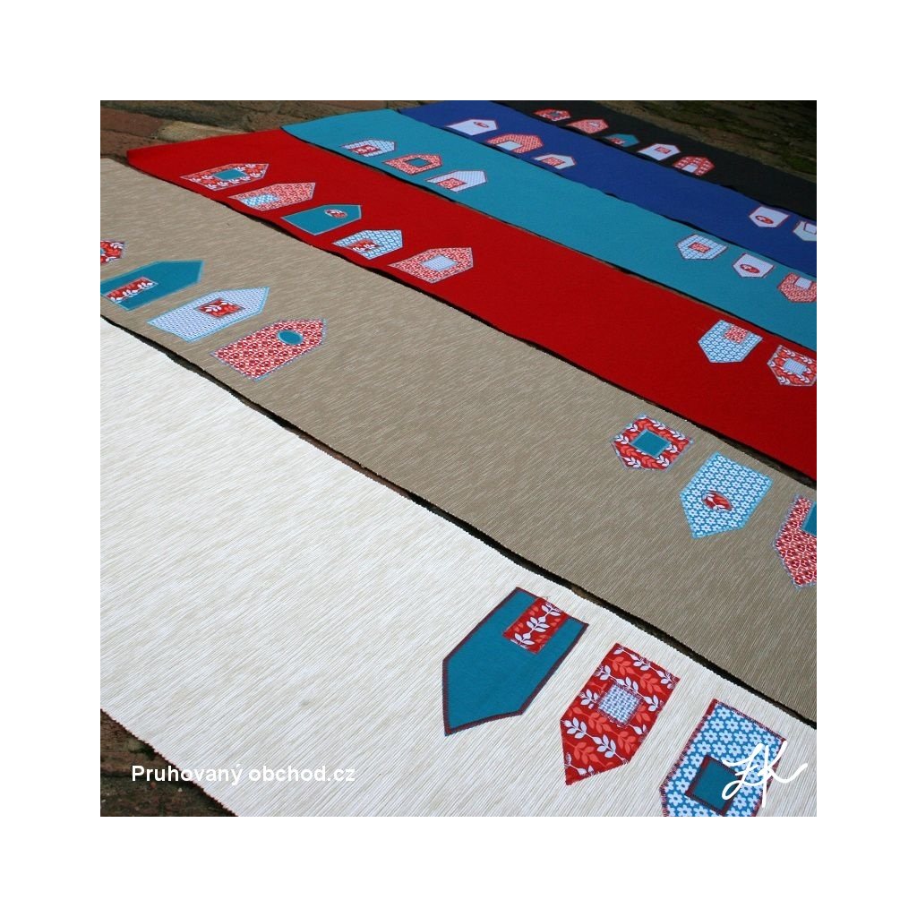 Dekorační běhoun na stůl, velikost 35 x 130 cm. Zdobeno našitou textilní aplikací dle vlastního návrhu, aplikace je z bavlněných látek.