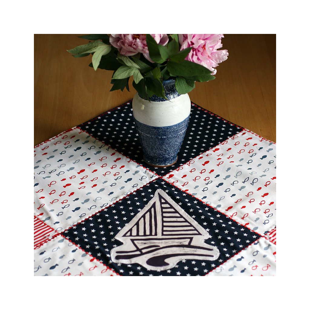 Ubrusy jsou sestaveny z 9 čtvreců, většinou v sestavě 4 čtverce jedné látky, 3 čtverce další látky a 2 čtverce z jiné látky, vybírám vždy látky a vzory k sobě ladící. Ubrus je podložen většinou jednobarevnou látkou, je tedy oboustraný, bez viditelných okrajů, švů apod.