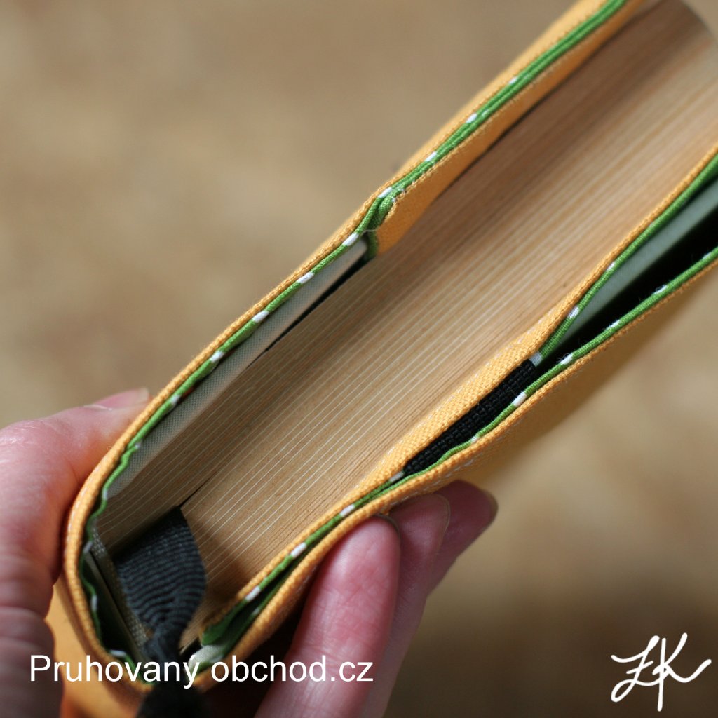 Obaly na knihy mají jednu záložku pevně ušitou, druhá se tvoří pomocí všité gumy, je tedy možné ho upravit na různě silnou knihu. Je všita textilní záložka. Výška obalu cca 23 až 24,5cm. Tloušťka hřbetu až 6cm.