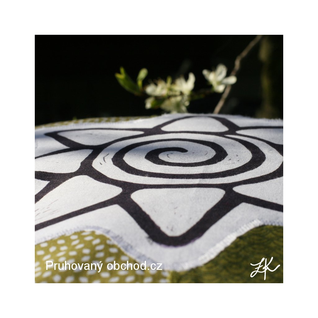 Povlak na polštář, sestaven vždy z několika látek, doplněn autorským linorytem. Každý kus je originál, vyhotoven většinou po jednom kusu. Výplň není součastí. Zadní část je řešena obálkově (skrytý plnicí otvor ze zadní strany, tj. bez knoflíků). Lze prát na 40°.